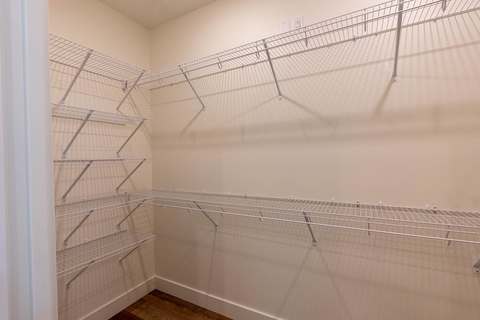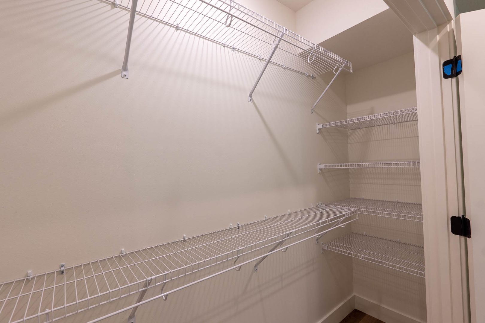 Utility room with washer, dryer, and a double bank of adjustable shelves for storage